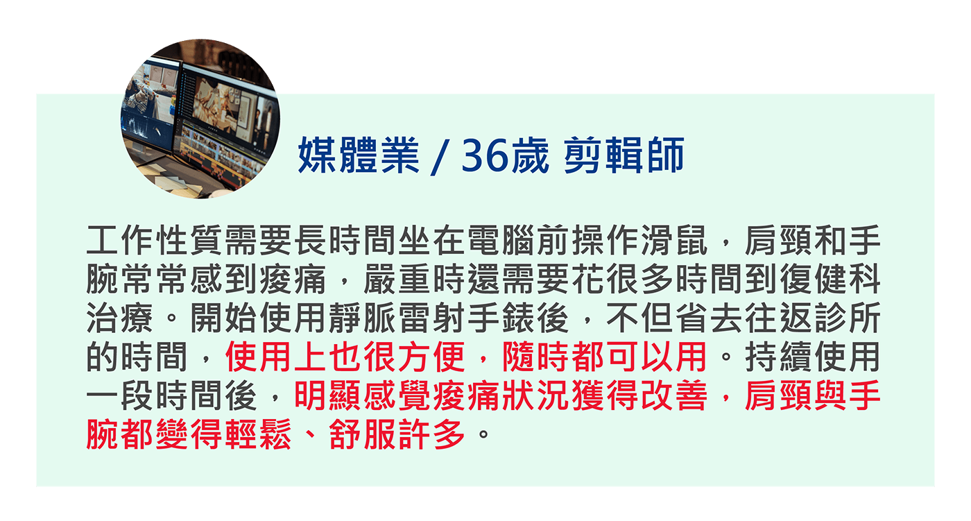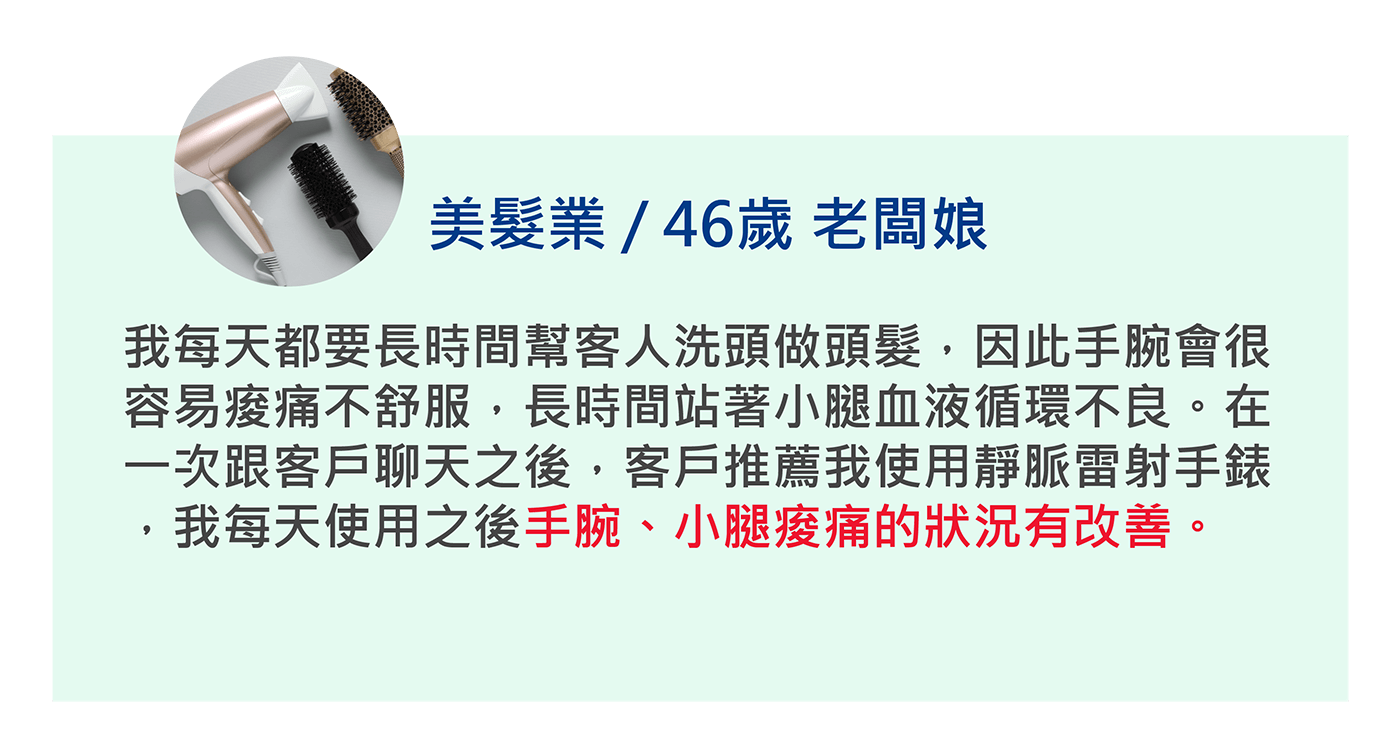 | 原理 | 透過半導體雷射治療,同時照射 靜脈與動脈,兼具治療與保健 |