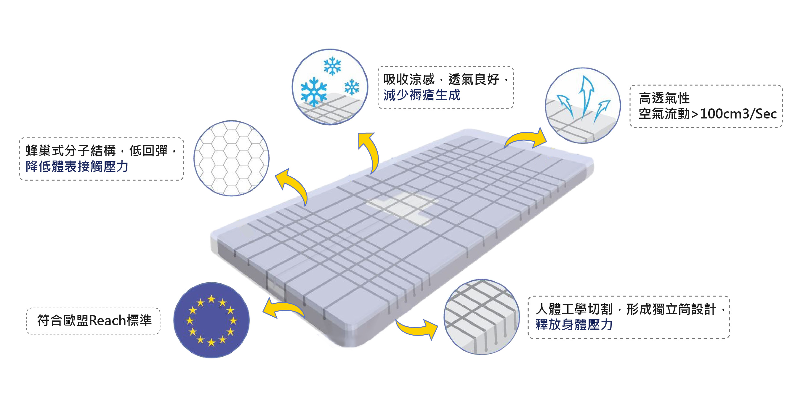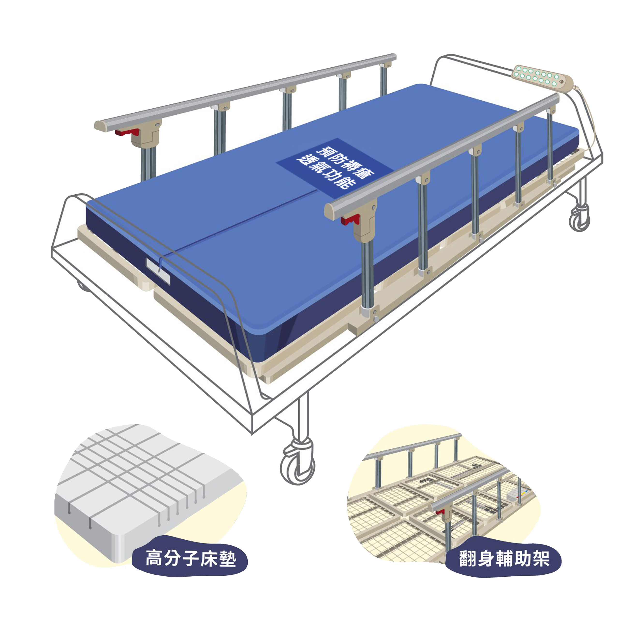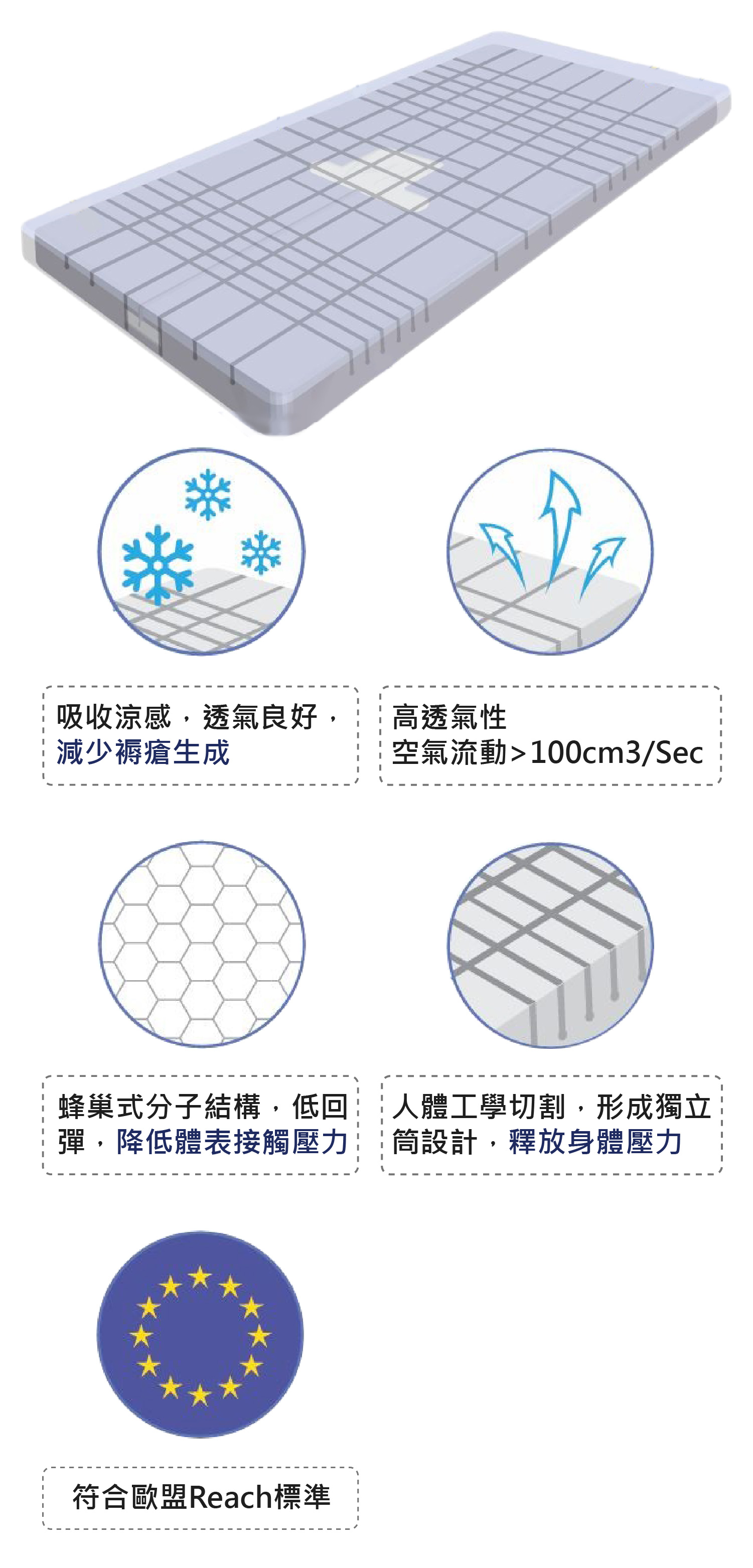 此外,「全自動翻身輔助床」搭載的「高分子蜂巢床墊」採用低回彈材質與獨立筒設計,符合歐盟REACH標準,能有效減少體表壓力,保持床墊與肌膚之間的空氣流通,減少濕氣與熱氣積聚,從而避免皮膚壓傷的問題。這款床墊兼具透氣性與舒適性,非常適合長期臥床者使用。
