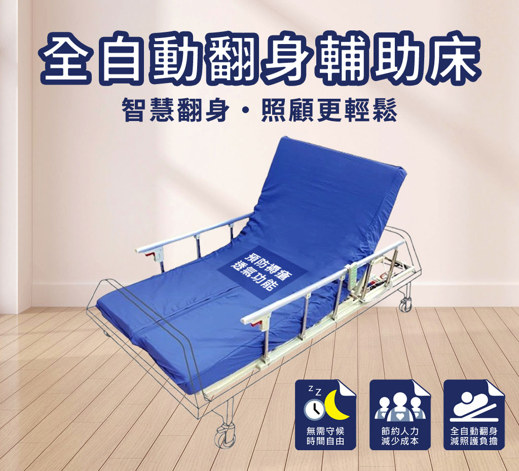 「全自動翻身輔助床」專為長期臥床者設計,配備兩種可重複循環的自動翻身模式,並可通過遙控器根據照護需求調整不同角度。無論是起背、抬腿、輔助下床,還是幫助病患翻身、拍背、抽痰、餵食、進行復健運動等,都能輕鬆完成,極大提高照護效率。