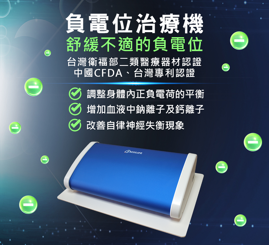 負電位治療機是利用高壓電的單極輸出,在人體周圍形成穩定的負電位場。當人體置於約 -3,000 至 -9,000 伏特 的高壓電場中,身體表面會自然形成一個電位環境,使體內正電荷產生重新排列與調整。 此過程著重於高電壓、低電流的原理,在人體可承受的安全範圍內,模擬自然界的電場作用,協助調節體內正負電荷的平衡。透過電位環境的改變,有助於促進血液中鈉離子與鈣離子的活動,使血液狀態趨於弱鹼性,進而改善自律神經失衡的情況。 同時,也可活化細胞的新陳代謝機能,支持身體自我調整與修復能力,達到日常保健與健康維持的目的。